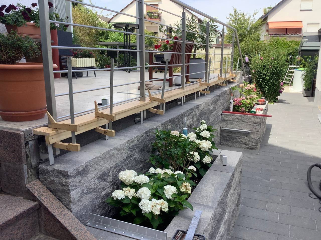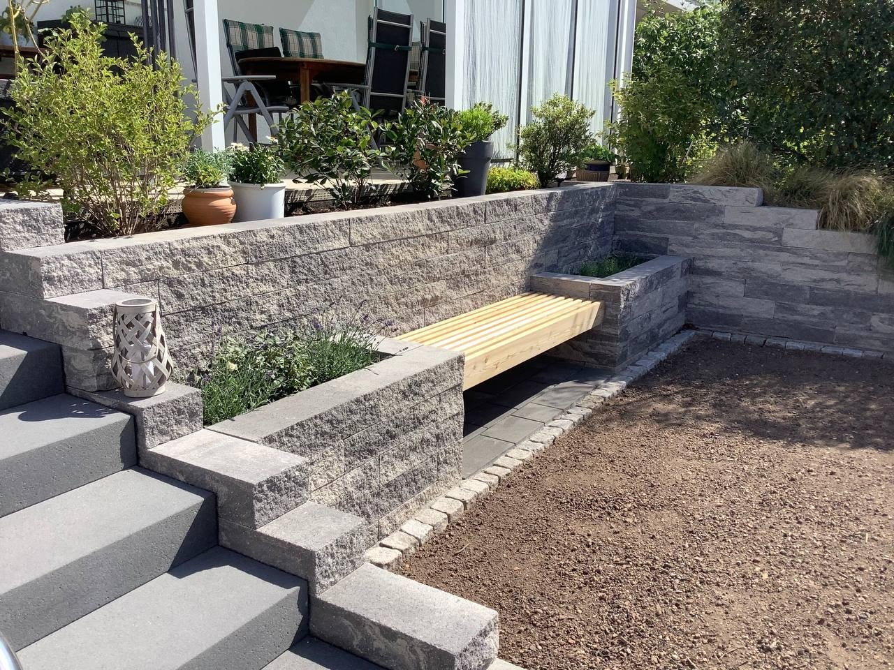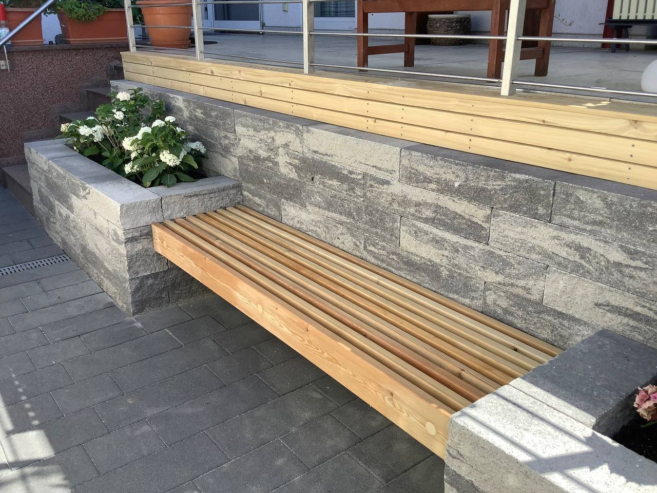 Bei diesem Beitrag handelt es sich um eine Mauerstellung mit selbstgebauter Holzbank als Sitzmöglichkeit. Zu Beginn wurde die Mauer aufgebaut und diese Mauersteine stammen von der Firma Rinn. Dabei handelt es sich um die Catania Mauer. Mit dieser wurde der Bereich erschaffen, wo die spätere Holzbank integriert werden sollte. Des Weiteren wurden mit ihr auch Pflanzbeete errichtet.Die Holzbänke wurden durch unsere Mitarbeiter selber errichtet und hergestellt. Auf den Bildern ist zu sehen, wie die Bänke hergestellt und eingesetzt wurden.Falls Sie auch Interesse an diesen Mauersteinen haben oder an einer selbstgebauten Holzbank durch uns, dann können Sie sich gerne bei uns melden.