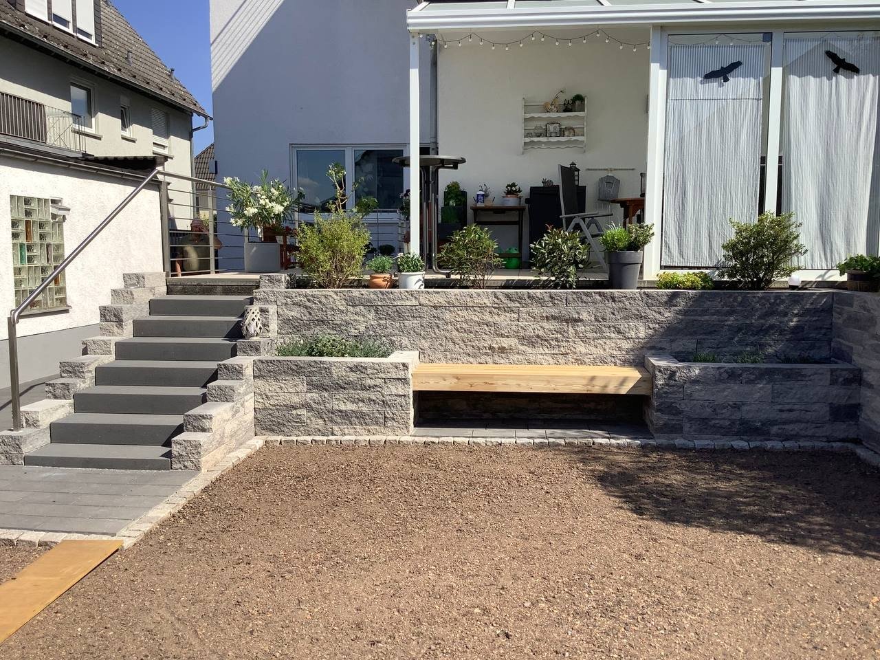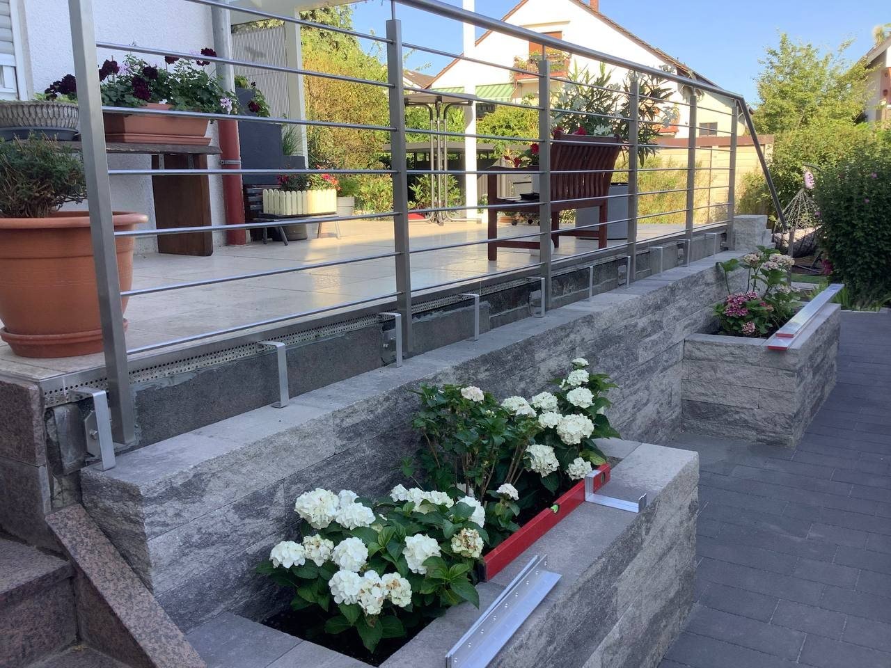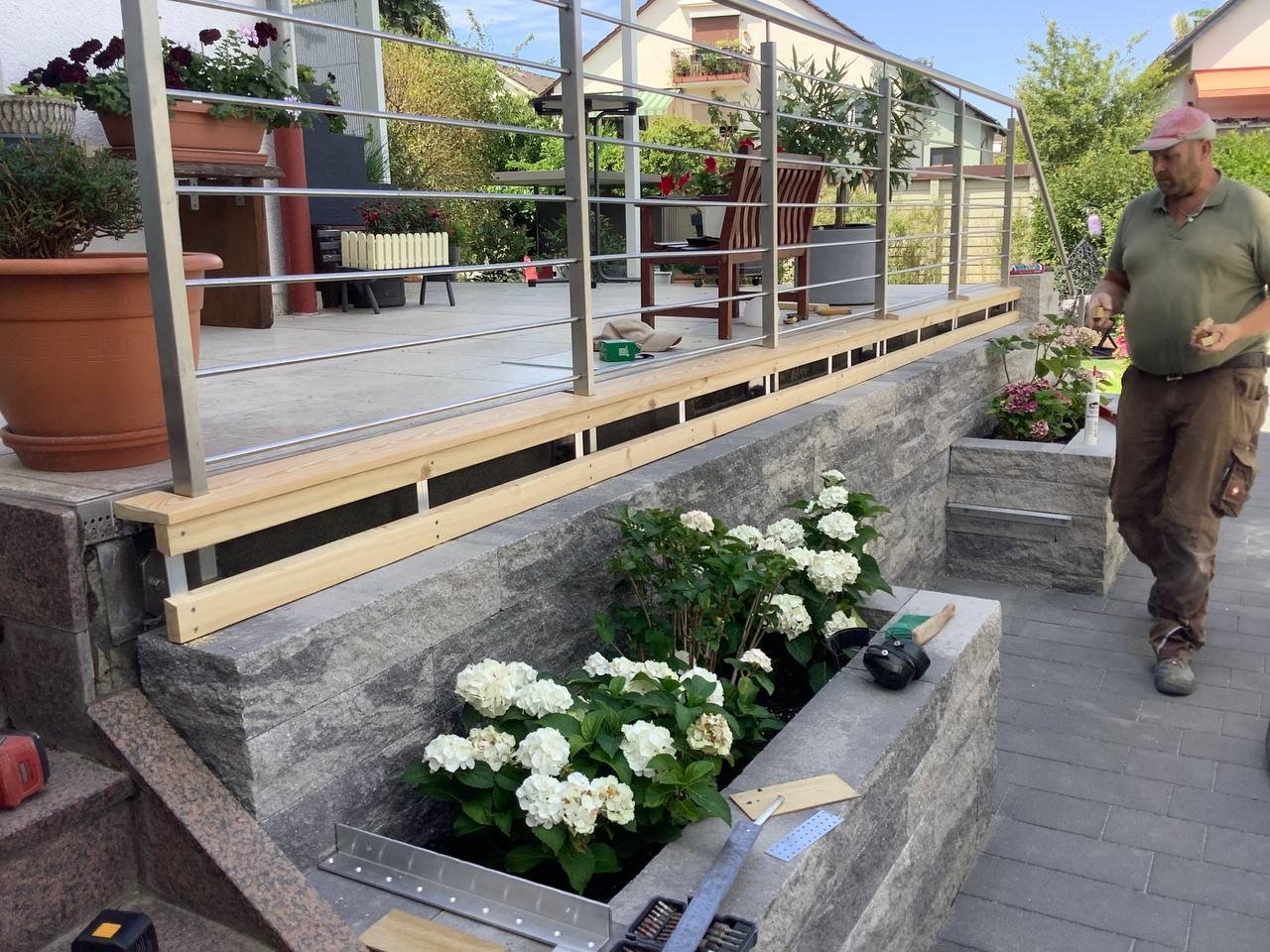 Bei diesem Beitrag handelt es sich um eine Mauerstellung mit selbstgebauter Holzbank als Sitzmöglichkeit. Zu Beginn wurde die Mauer aufgebaut und diese Mauersteine stammen von der Firma Rinn. Dabei handelt es sich um die Catania Mauer. Mit dieser wurde der Bereich erschaffen, wo die spätere Holzbank integriert werden sollte. Des Weiteren wurden mit ihr auch Pflanzbeete errichtet.Die Holzbänke wurden durch unsere Mitarbeiter selber errichtet und hergestellt. Auf den Bildern ist zu sehen, wie die Bänke hergestellt und eingesetzt wurden.Falls Sie auch Interesse an diesen Mauersteinen haben oder an einer selbstgebauten Holzbank durch uns, dann können Sie sich gerne bei uns melden.
