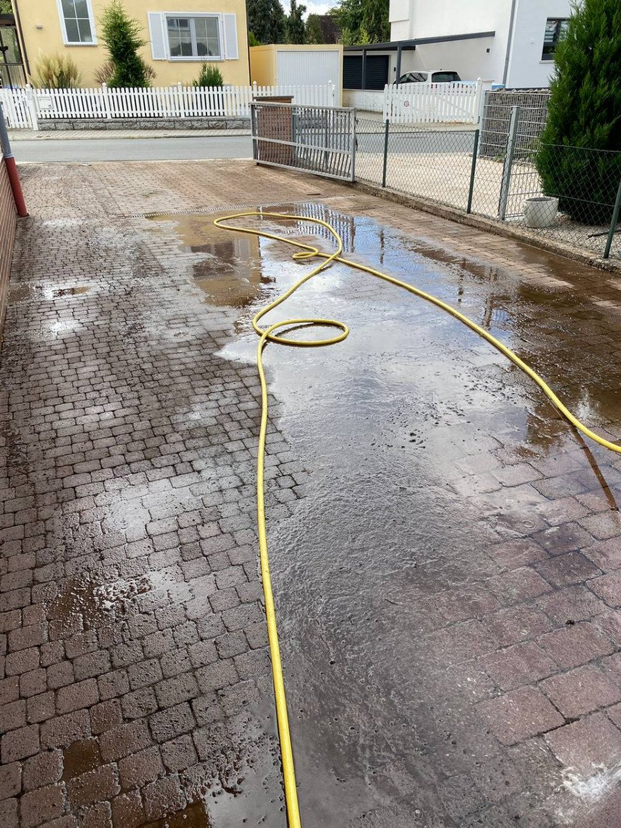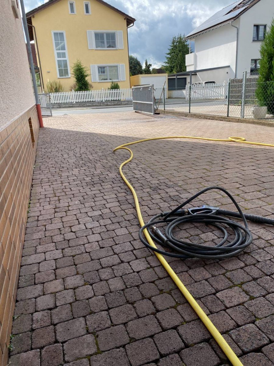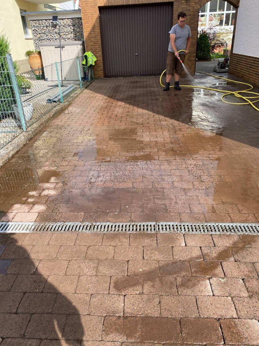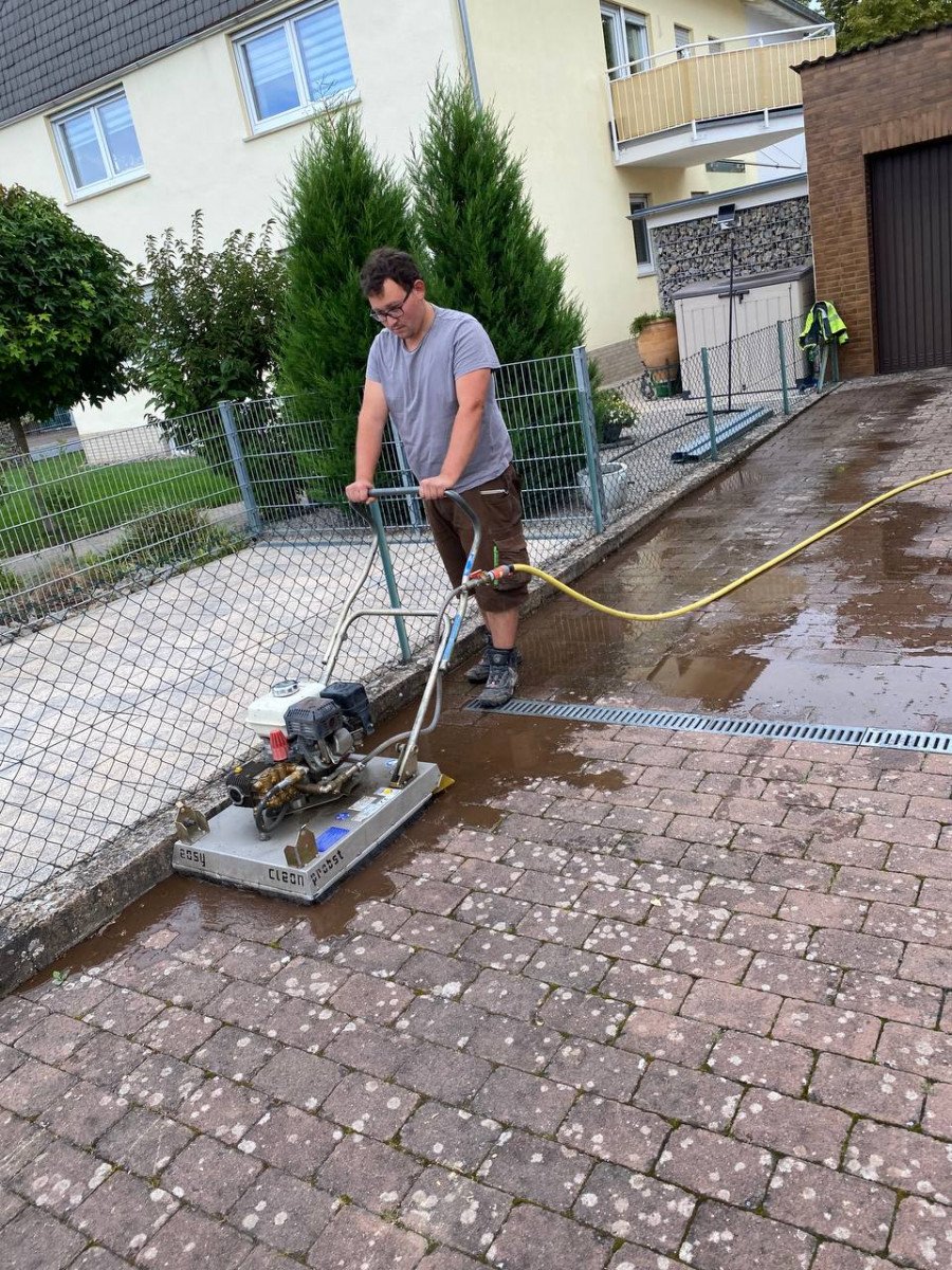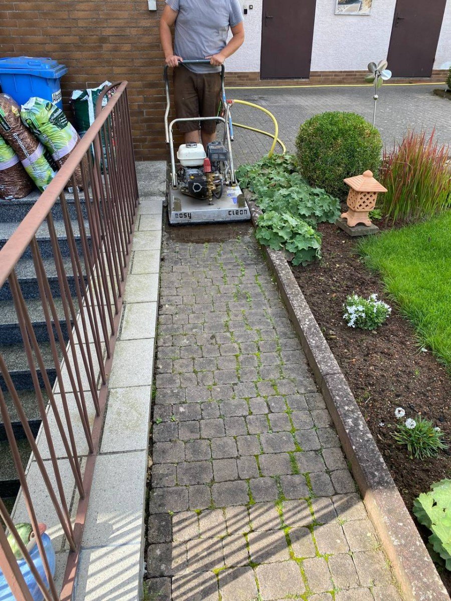 Beim Easy Clean handelt es sich um zwei mit hoher Geschwindigkeit dicht über der Oberfläche rotierende, speziell ausgebildete Sprühdüsen reinigen unter der Schutzhaube nicht nur die Oberfläche „porentief“ und gleichmäßig, sondern spülen auch die üblicherweise mit Sedimenten bzw. Moos verunreinigten Fugen zu einer geringen Tiefe aus. Die so gereinigten Fugen sind anschließend nicht nur sauber, sondern auch wieder wasserdurchlässiger. Des Weiteren ist die Nutzung durch ein einfaches, leichtes Schieben des Gerätes, dank vier große Räder unter der Spritzschutzhaube machbar.Da es sich bei dem Pflaster um befahrene Beläge handelt, wurden die Fugen nachgesandt.Dasselbe Prinzip ist nicht nur auf Pflastersteinen einsetzbar, sondern auch auf Terrassenplatten. Dort ist die Säuberung mit dem Easy Clean auch sehr einfach und hilfreich.