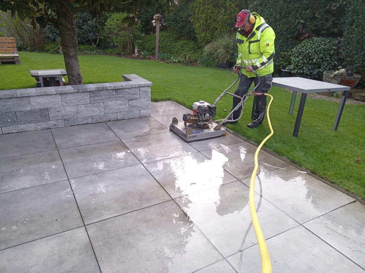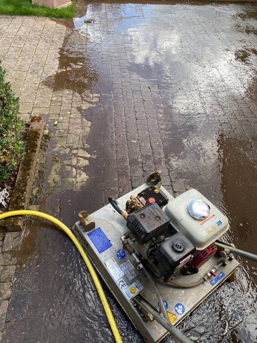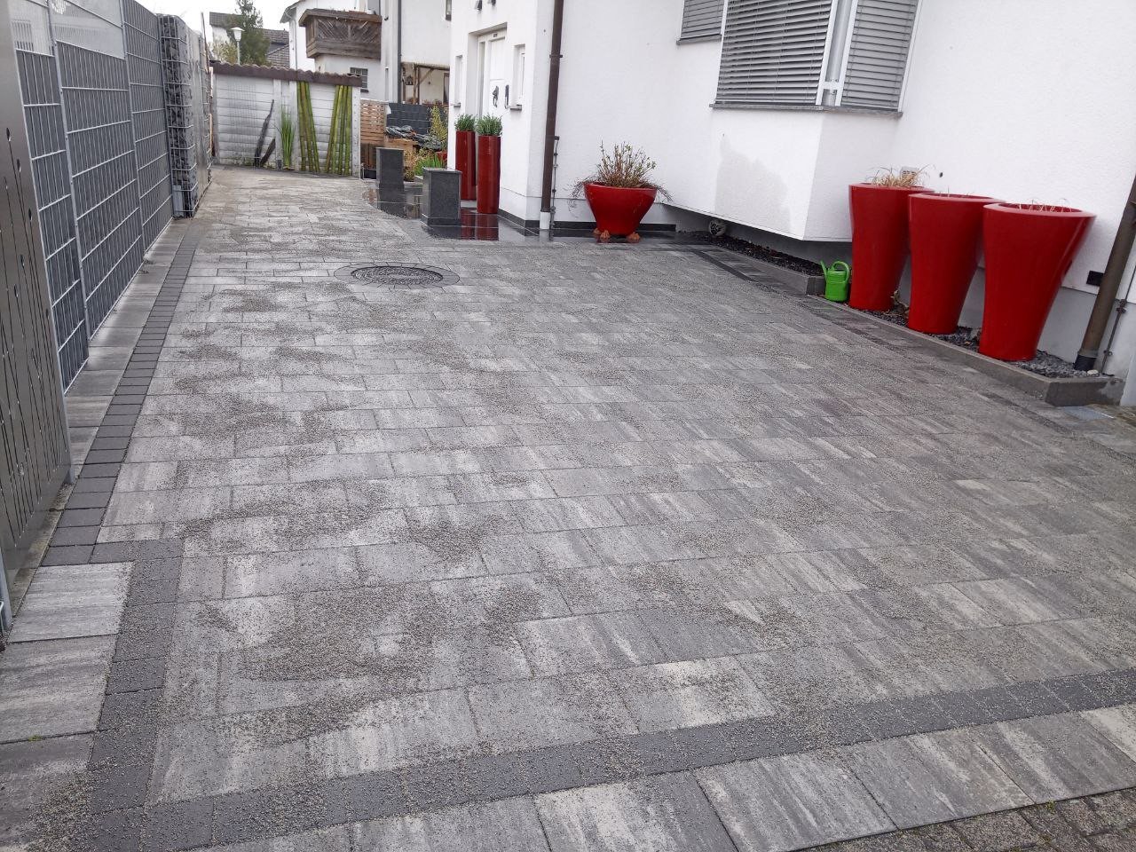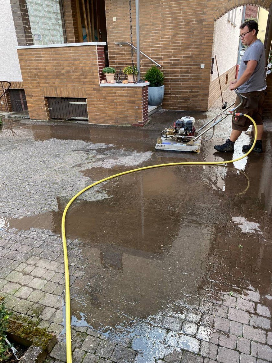 Beim Easy Clean handelt es sich um zwei mit hoher Geschwindigkeit dicht über der Oberfläche rotierende, speziell ausgebildete Sprühdüsen reinigen unter der Schutzhaube nicht nur die Oberfläche „porentief“ und gleichmäßig, sondern spülen auch die üblicherweise mit Sedimenten bzw. Moos verunreinigten Fugen zu einer geringen Tiefe aus. Die so gereinigten Fugen sind anschließend nicht nur sauber, sondern auch wieder wasserdurchlässiger. Des Weiteren ist die Nutzung durch ein einfaches, leichtes Schieben des Gerätes, dank vier große Räder unter der Spritzschutzhaube machbar.Da es sich bei dem Pflaster um befahrene Beläge handelt, wurden die Fugen nachgesandt.Dasselbe Prinzip ist nicht nur auf Pflastersteinen einsetzbar, sondern auch auf Terrassenplatten. Dort ist die Säuberung mit dem Easy Clean auch sehr einfach und hilfreich.