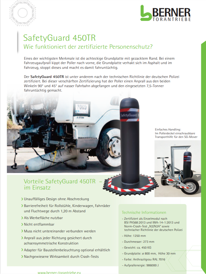 Der Berner SafetyGuard 450TR hat entscheidende Vorteile:-er erfüllt selbst strenge Sicherheitskonzepte, ist flexibel einsetzbar und modular erweiterbar-seine unauffällige Form integriert sich in die jeweilige Umgebung und kann zusätzlich als Werbefläche genutzt werden. Der SafetyGuard 450TR ist unter anderem nach der technischen Richtlinie der deutschen Polizei zertifiziert.Weitere Informationen können Sie aus den Bildern entnehmen.Einfach auf das jeweilige Bild klicken.